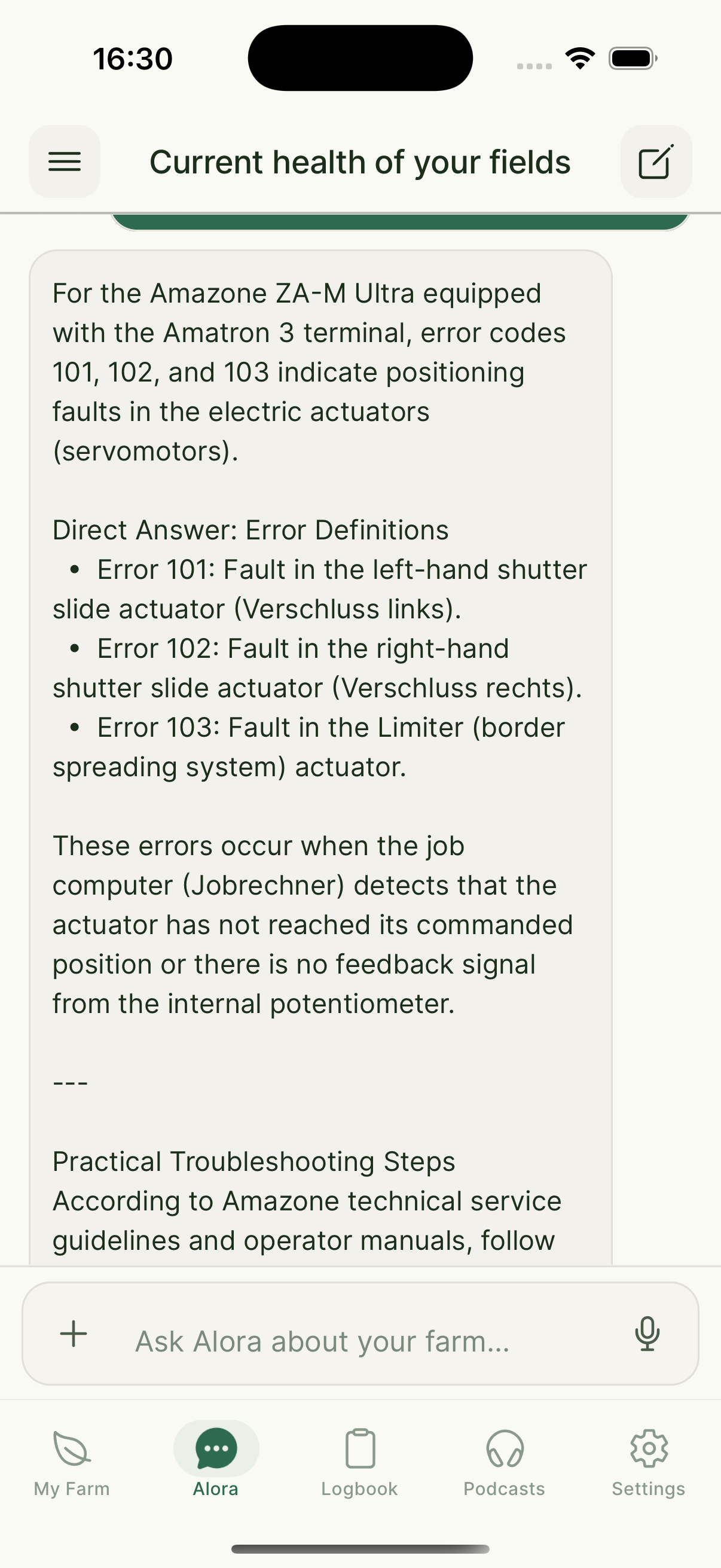 Fragen Sie Alora — per Sprache oder Text. Sie kennt Ihre Schläge und liefert klare Antworten aus Ihren eigenen Daten.