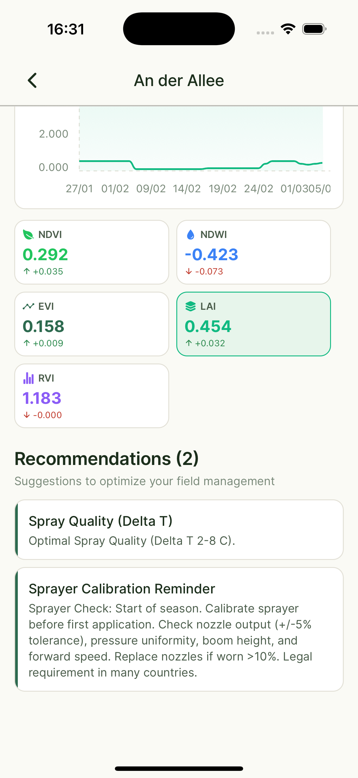 Tägliche Satellitenauswertung erkennt Vegetationsanomalien früh — Sie können handeln, bevor sich der Schaden ausbreitet.