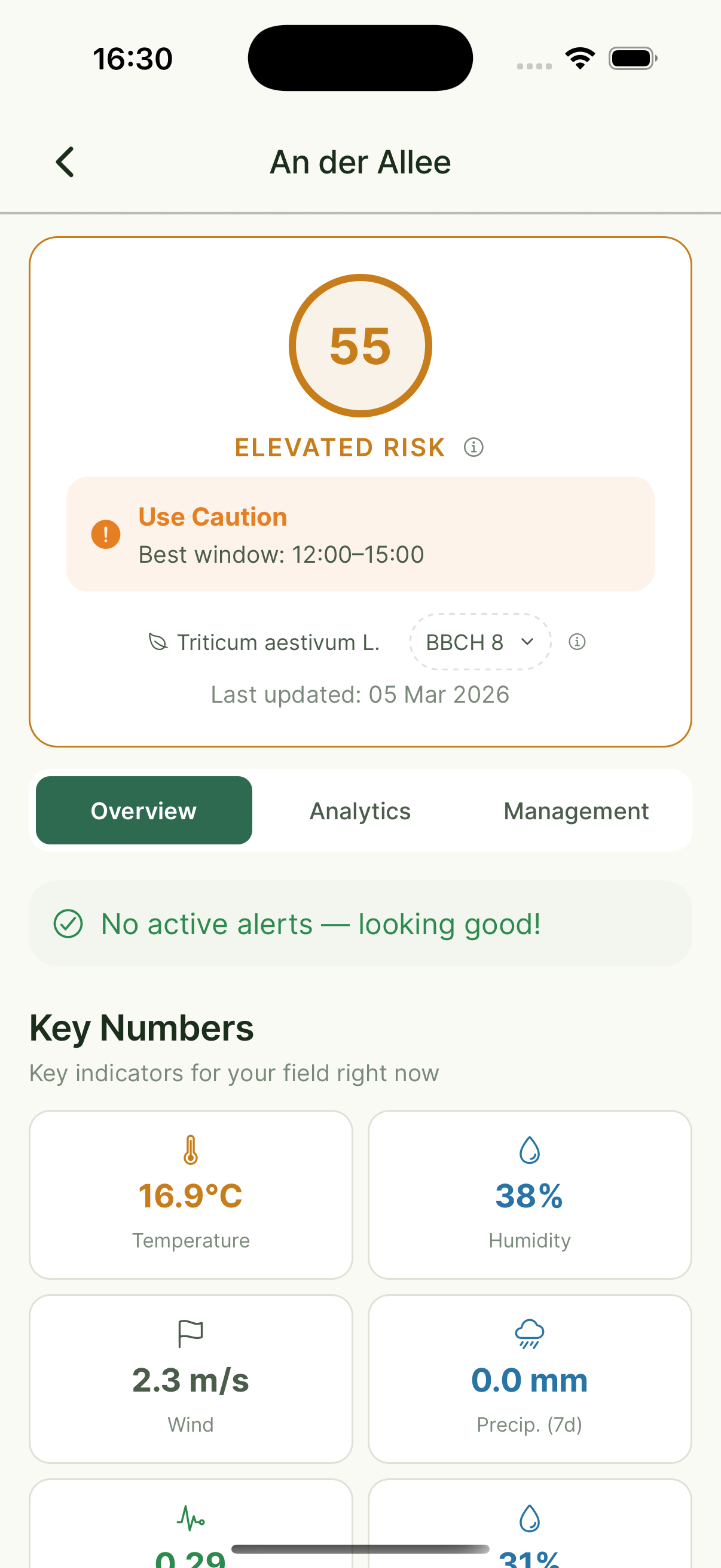 Täglicher Risikoindex pro Schlag, Zonen-Warnungen, optimale Spritzfenster