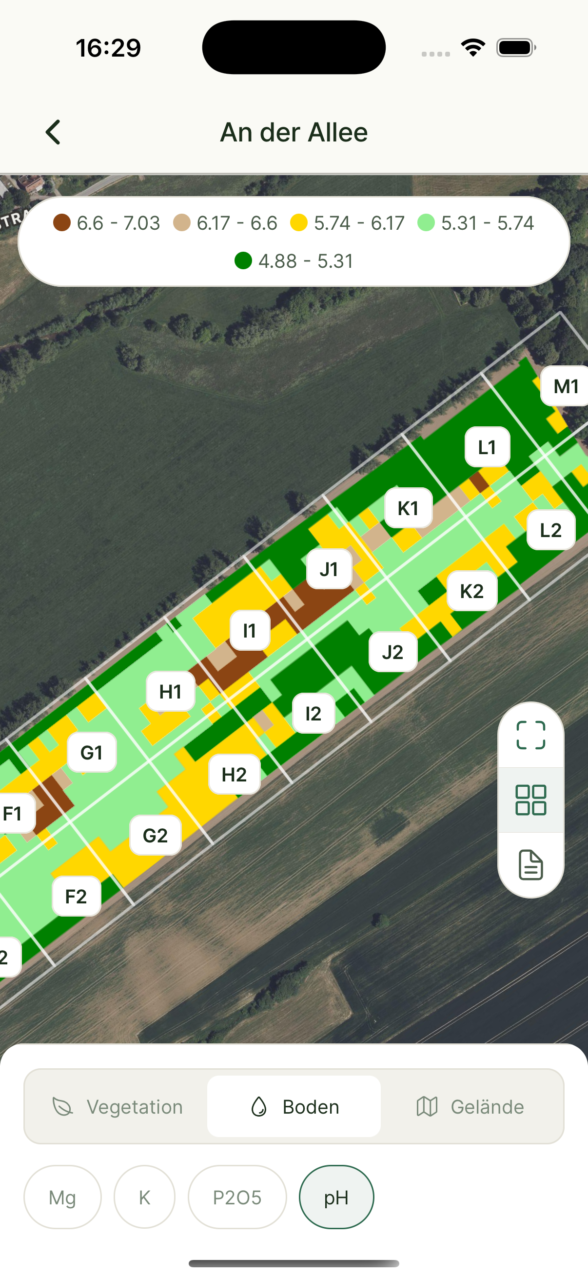 Alle vom Landwirt gemessenen Bodeneigenschaften (P, K, Mg, pH, organische Substanz u.v.m.)