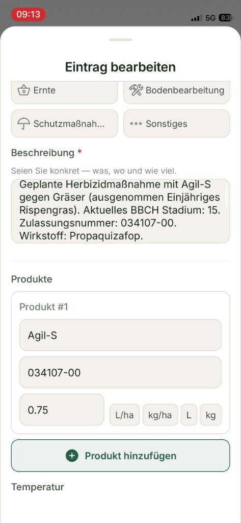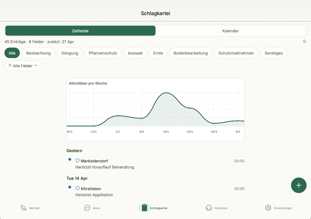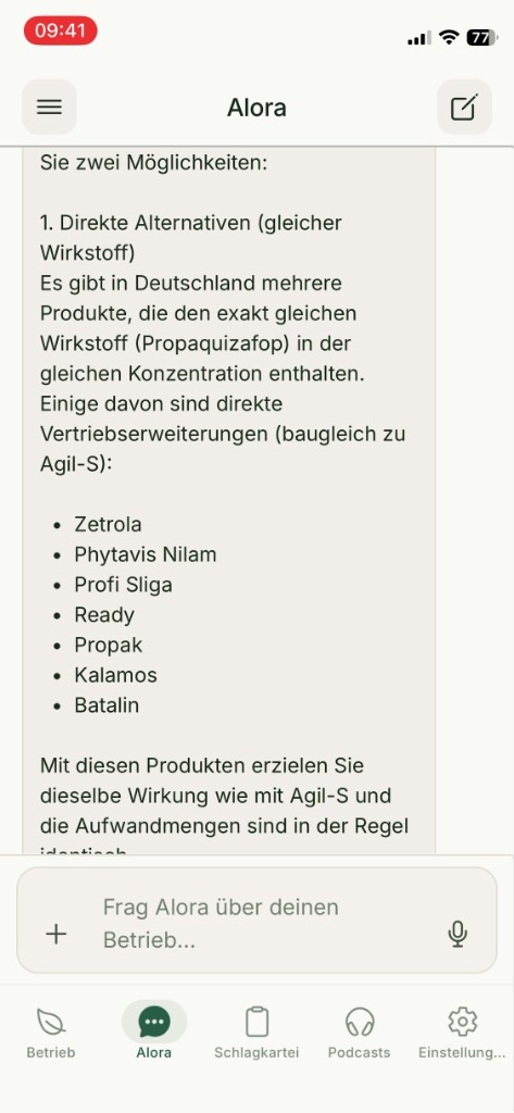 | 🎙 | Spracheingabe mit Kontextwissen | Mitarbeiter beschreiben die Maßnahme – Alora erkennt Produkt, Aufwandmenge, Zulassungsnummer und BBCH automatisch aus dem Betriebskontext. |