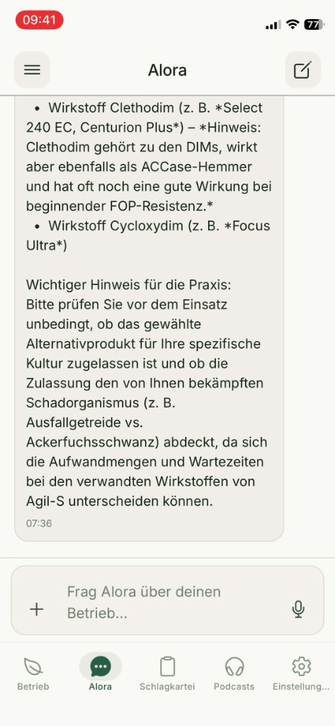 | Keine integrierte Fachberatung | Alora: PSM-Beratung & Zulassungsprüfung |