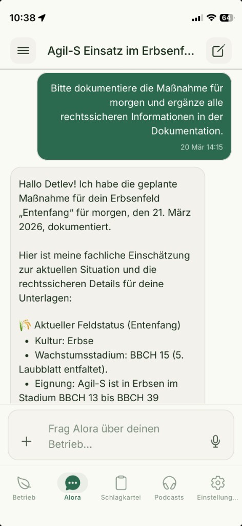 Der Betriebsleiter Detlev plant für sein Erbsenfeld „Entenfang“ (71 ha) den Einsatz des Herbizids Agil-S gegen Gräser. Sein Mitarbeiter erfasst die Maßnahme per Sprachdialog mit Alora – ohne einen einzigen Laufzettel.