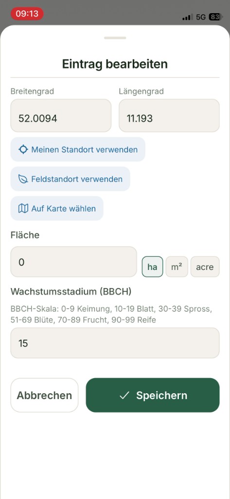 | 📍 | GPS-Georeferenzierung | Jede Maßnahme wird mit exakten GPS-Koordinaten gespeichert – teilflächengenau, für Behördennachweise und Precision Farming. |